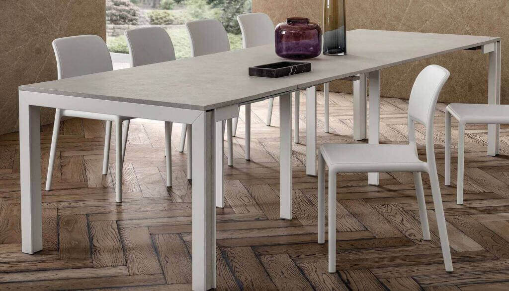Tavolo consolle allungabile con gambe in legno verniciato Bianco Opaco con inserto e piano HPL Cimant Ash