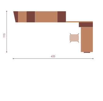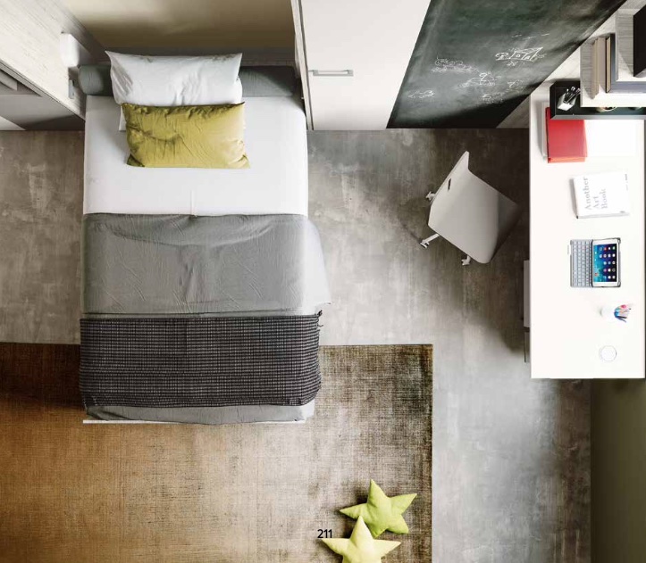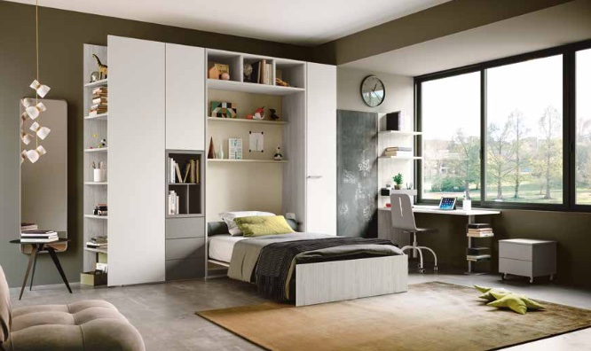 con spazi contenitivi aggiuntivi che consentono di affiancare al letto trasformabile uno sviluppo orizzontale delle forme.